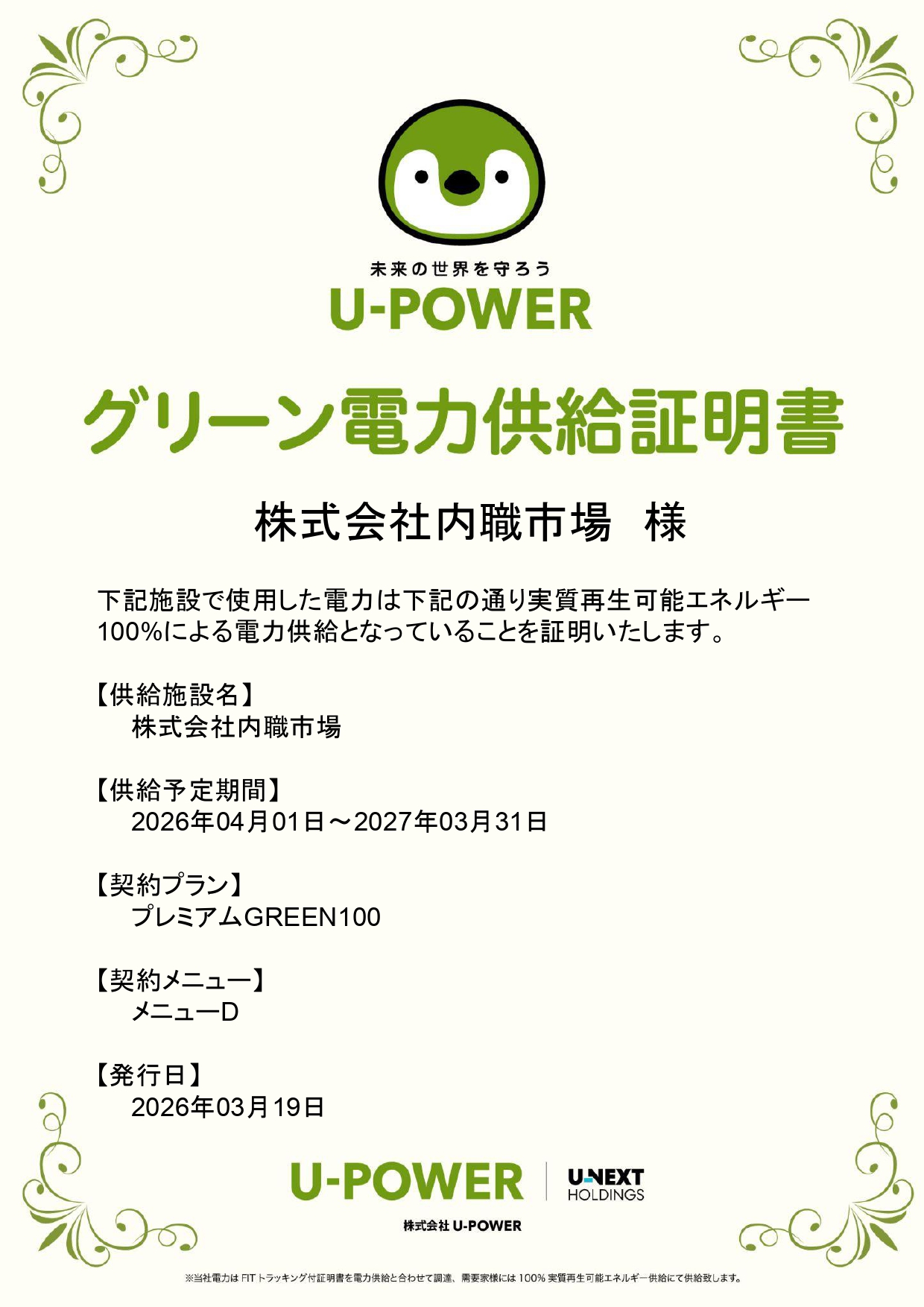 本取り組みでは、U-POWERが提供する「プレミアムGREEN100」プランを採用しています 。